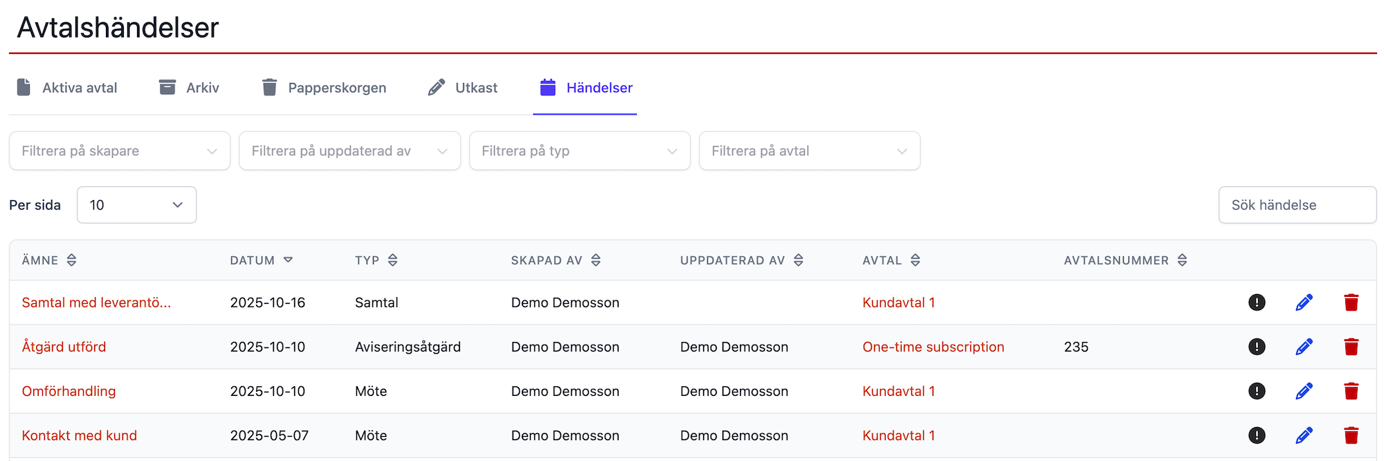 Du kan se en lista över alla avtalshändelser för alla avtal genom att gå till menyn "Avtal" och klicka på fliken "Händelser". Listan går att filtrera på de(n) som skapat eller uppdaterat en händelse och även se detaljer om kopplade dokument och kontaktperson genom att klicka på ikonen med ett i ute till höger.