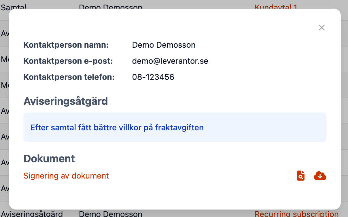 En avtalshändelse är en egen logg på avtalet. Här kan du ange om du t.ex gjort en omförhandling eller tilläggsbeställning, haft möte eller telefonsamtal. Det går också att länka till befintliga dokument på avtalet, ifall du förhandlat fram ett tilläggsavtal och anger detaljer i en avtalshändelse kan du länka till dokumentet direkt från händelsen.