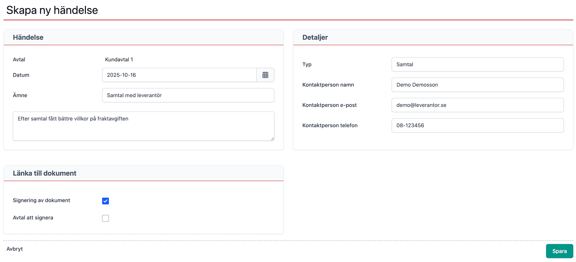 Du skapar en ny händelse genom att först gå in på detaljsidan för ett avtal och klickar sedan på knappen "Skapa ny" under listan med händelser till höger. Ange uppgifterna om händelsen och klicka för de dokument du vill länka till och klicka på Spara.