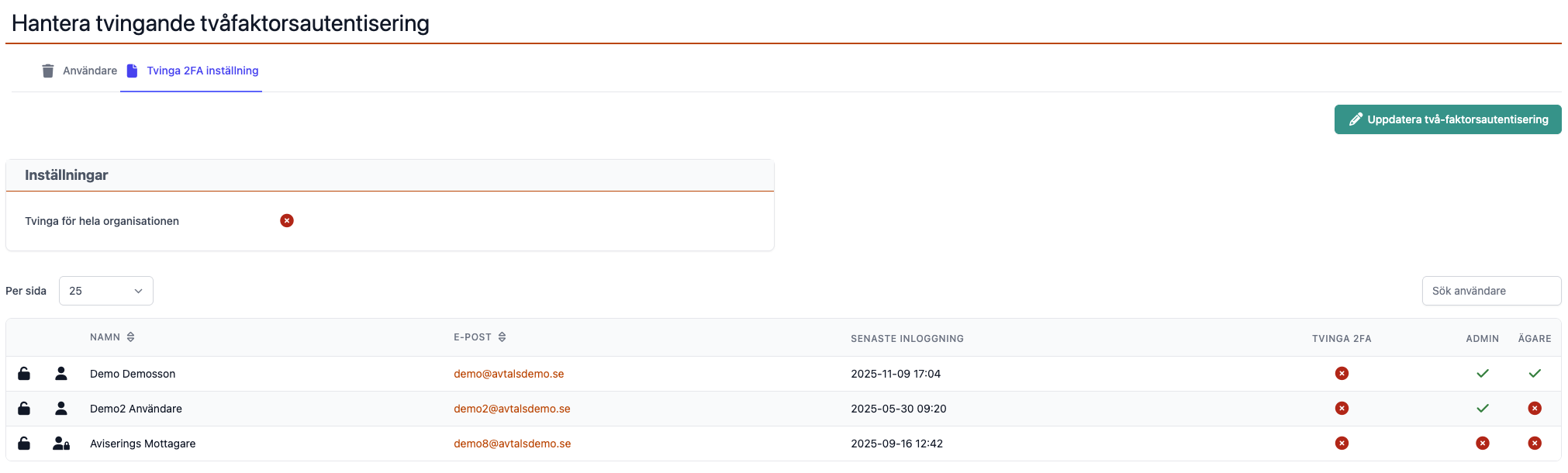 Klicka på menyn "Användare" och sedan fliken "Tvinga 2FA inställning". Här presenteras en lista med alla användare på ditt konto. Du kan göra inställning att tvinga att användare ställer in tvåfaktorsautentisering för alla nuvarande och framtida användare eller ange att endast specifika användare måste göra inställningen.