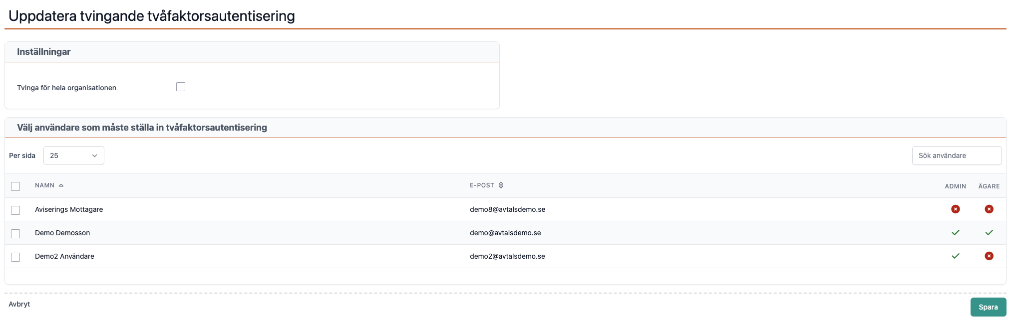 Klicka på knappen "Uppdatera tvinga två-faktorsautentisering" för att ställa in vilka användare eller om hela organisationen ska tvingas göra inställningen. Kryssa i antingen hela organisationen eller de användare som det gäller och tryck på Spara.